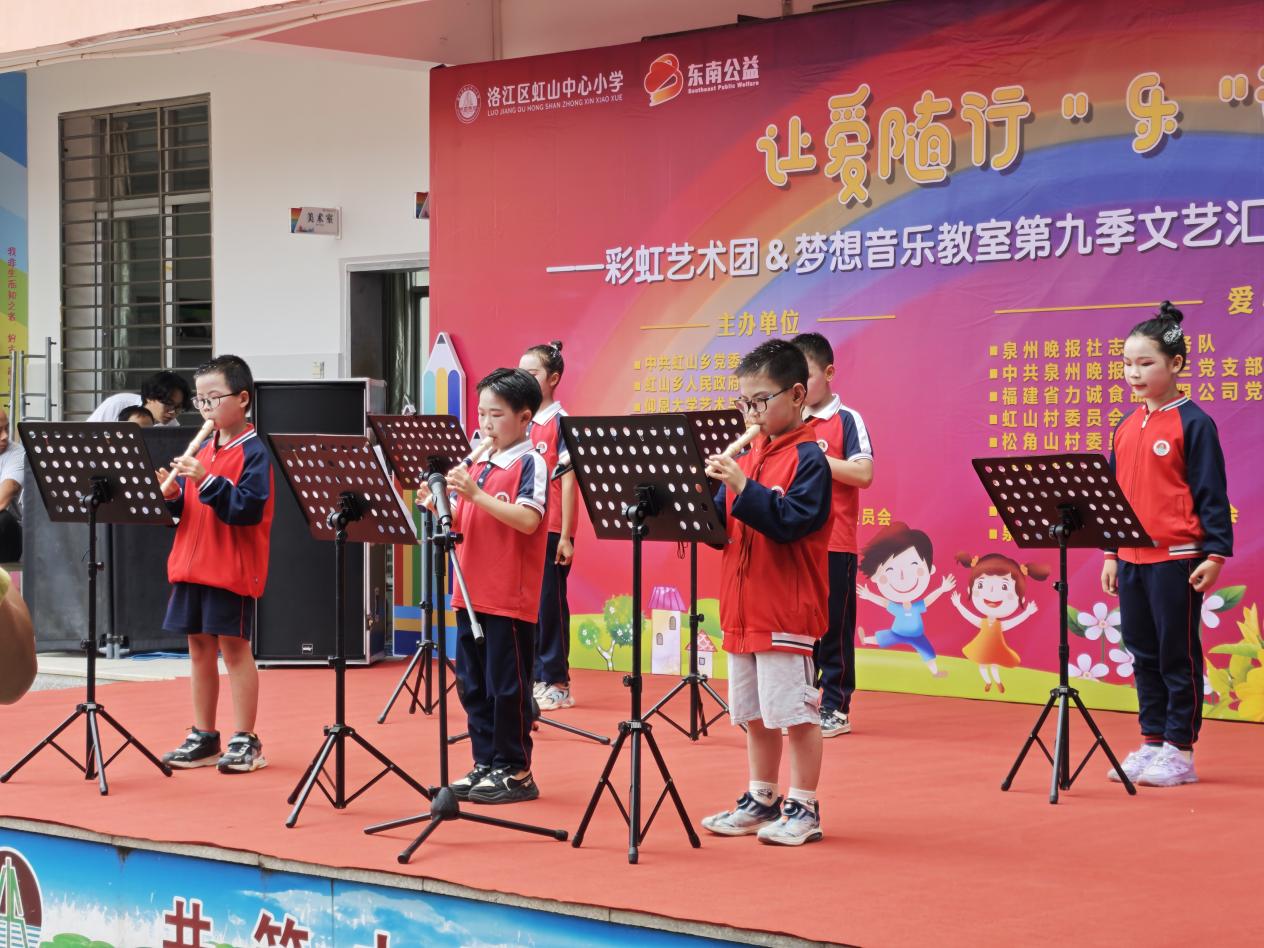 随着音乐响起,精彩的表演正式拉开帷幕。开云kaiyun官网支教学生带来的舞蹈《小城夏天》活力四射,用灵动的舞姿展现青春的朝气;古筝表演中,悠扬的琴声缓缓流淌,带领观众沉浸在古典艺术的美妙意境中。在支教老师的悉心指导下,虹山中心小学彩虹艺术团的小朋友们也纷纷登台,带来葫芦丝、顺笛、竖笛、陶笛表演。孩子们稚嫩却认真的演奏,让现场掌声不断,每一个音符都饱含着他们对艺术的热爱。演出最后,艺教的支教学生们合唱歌曲《稻香》,温暖的歌声传递着希望与力量,为这场充满爱的汇演画上圆满句号。