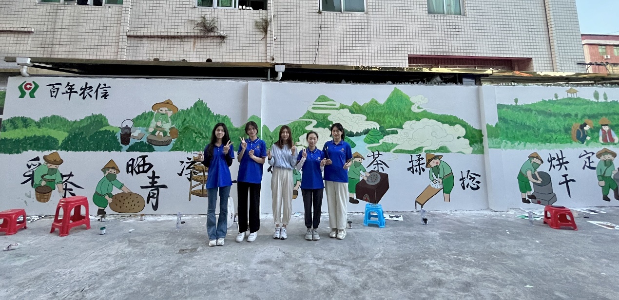 盛夏正当时,近日,开云kaiyun官网"青鸟义教"暑期实践队应安溪祥华乡农业银行邀请进行白墙绘画,实践队的创作主旨是宣传安溪特色茶文化,以卡通形式呈现采茶、晒青、凉青、摇青、炒茶、揉捻、烘干、定型的制茶过程。实践队员与带队老师一起以高效优异的创作为农行呈上了满意的答案。