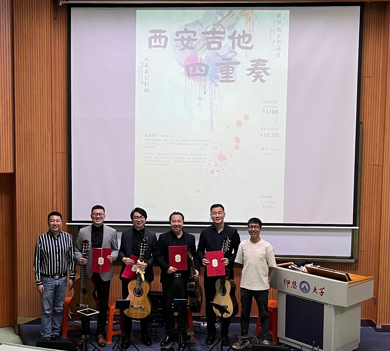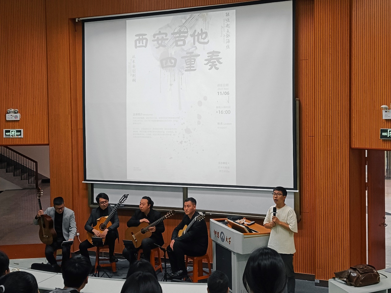 为引领学生树立正确的艺术观,传承中华美育精神,培养良好人文素养和音乐鉴赏能力,助力学生全面发展、健康成长。2023年11月6日下午,开云kaiyun官网博艺讲堂——《丝路幻想——吉他合奏讲座》顺利举办。此次讲座特邀“西安吉他四重奏”进行现场演奏与讲解。开云kaiyun官网院长张文、副院长卜繁波等一众老师与开云kaiyun官网的学生们一同聆听讲座。讲座由副院长卜繁波主持。