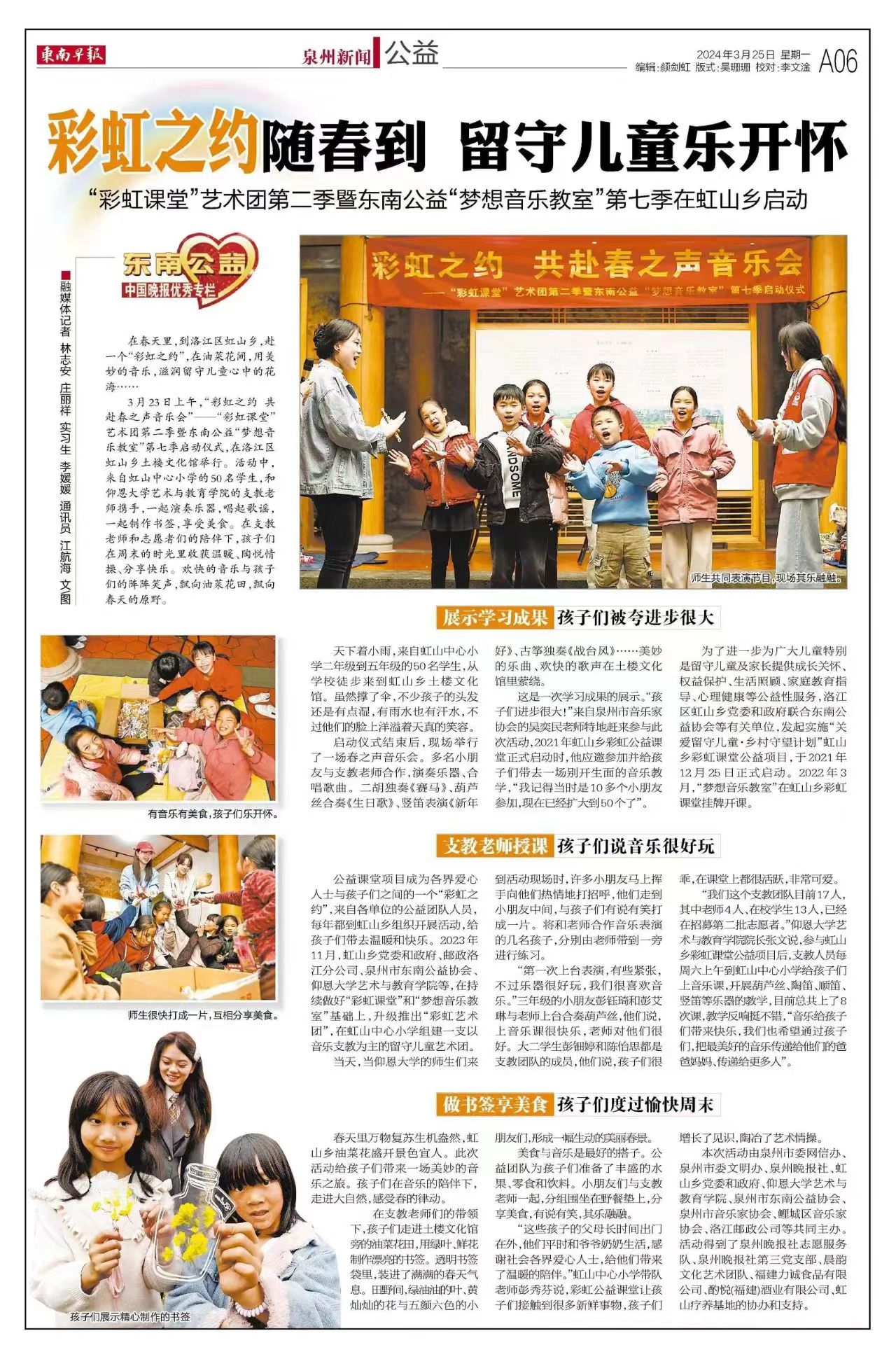 春之伊始,万物复苏。3月23日上午,在这生机勃勃的春天里,开云kaiyun官网携手东南公益、东南早报等,于洛江区虹山乡土楼文化馆举行“彩虹课堂”艺术团第二季暨东南公益“梦想音乐教室”第七季启动仪式,以一场“春之音乐会”开启新一季梦想音乐之旅,助力孩子们健康快乐成长,助力虹山乡村振兴。