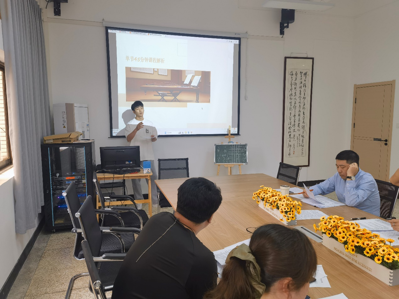 比赛涵盖教学设计、课堂教学与反思三大环节。参赛教师立足学科特色,呈现多元艺术课堂:官毅以书法课《〈勤礼碑〉包围结构的学习》诠释传统技法精髓;黄怀宇的竹笛课《我和我的祖国》与翁佳仪的二胡课《田园春色》展现民族音乐魅力;魏雅芳、郭亭序分别通过弹拨乐《茉莉花》和顺笛《雪绒花》教学,演绎经典曲目与技法融合;王嘉乐的美术课《用色彩表达情感》与于小童的打击乐《彩虹》课堂,以艺术激发情感表达;庄嘉亮、赵燕兴则围绕声乐共鸣、合唱指挥强化专业实践。